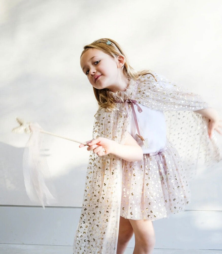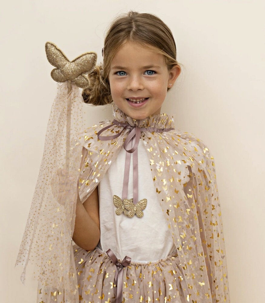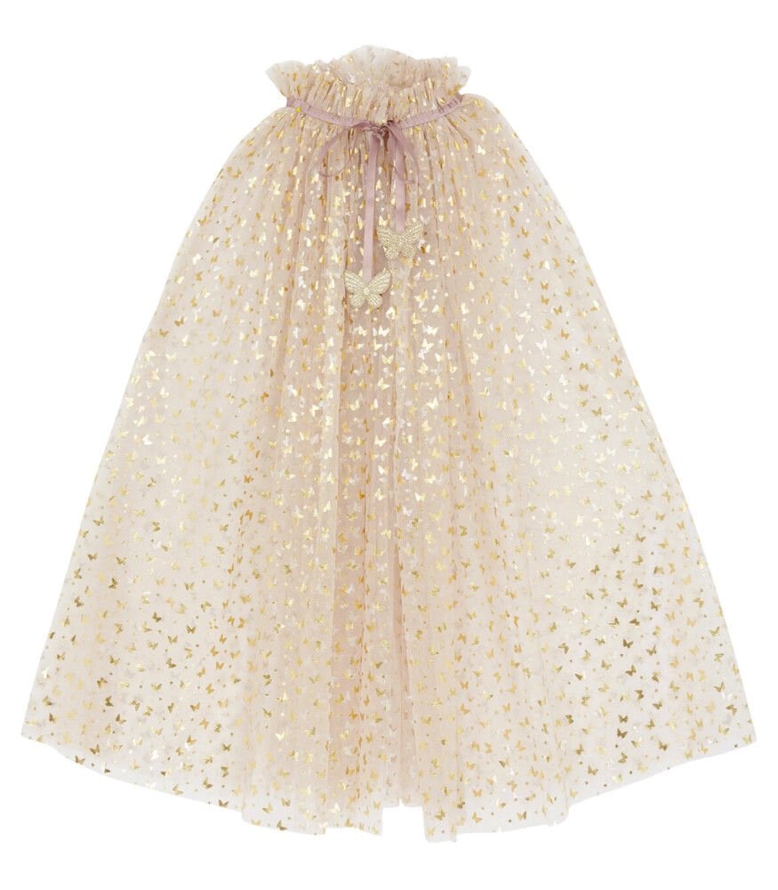 Metalik altın kelebeklerle süslenmiş, güzel yumuşak pembe tül katmanlarına sahip olan bu harika pelerin, saten kurdele, altın parıltılı kelebek aksesuarları ve çıtçıtlı kapama düğmesi ile tamamlanmıştır.