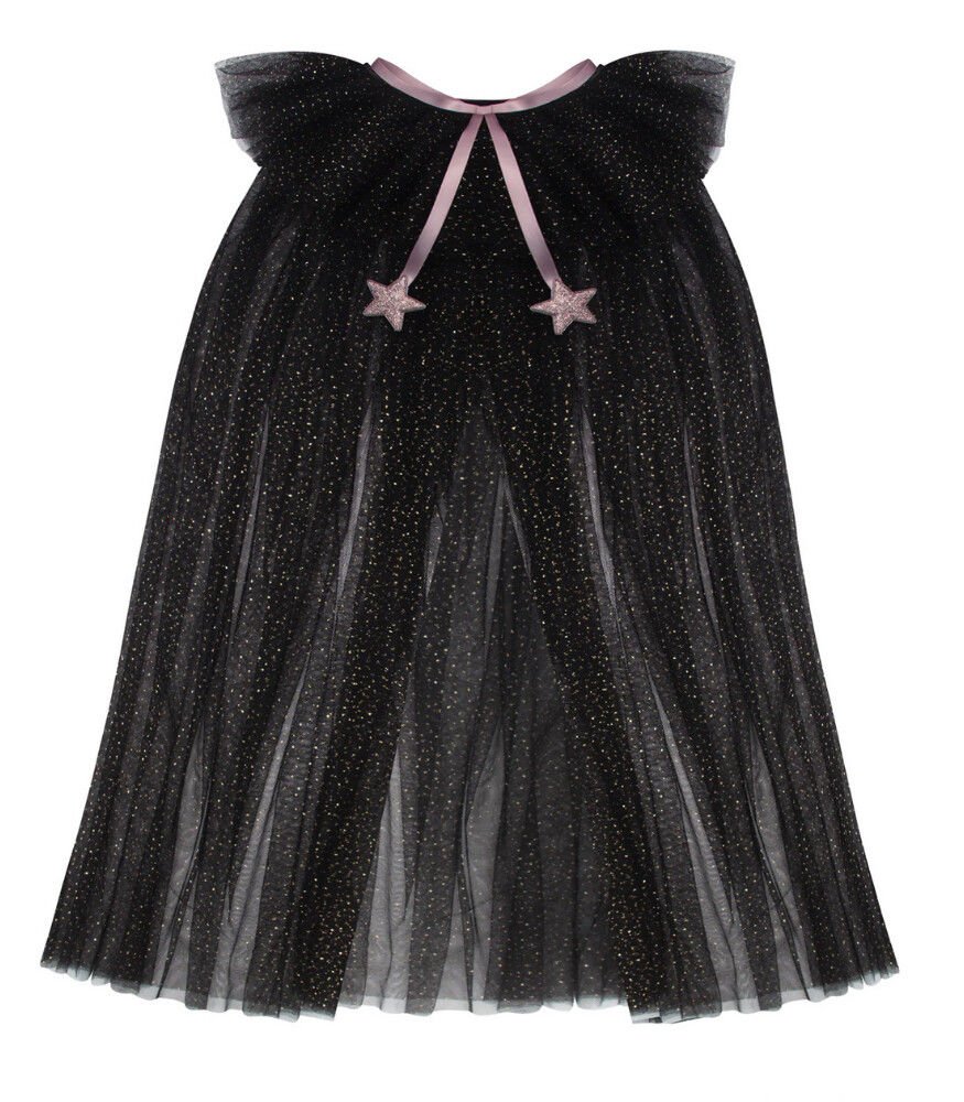 Metalik altın beneklerle süslenmiş yumuşak siyah tül katmanları ve yakasındaki fırfır detayı ile bu büyüleyici pelerin, küçük cadıların en sevdikleri aksesuar olacak!