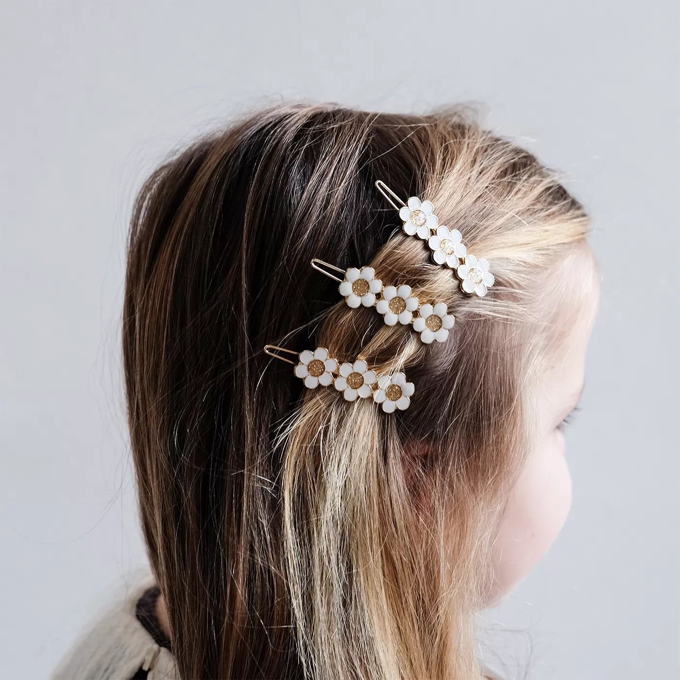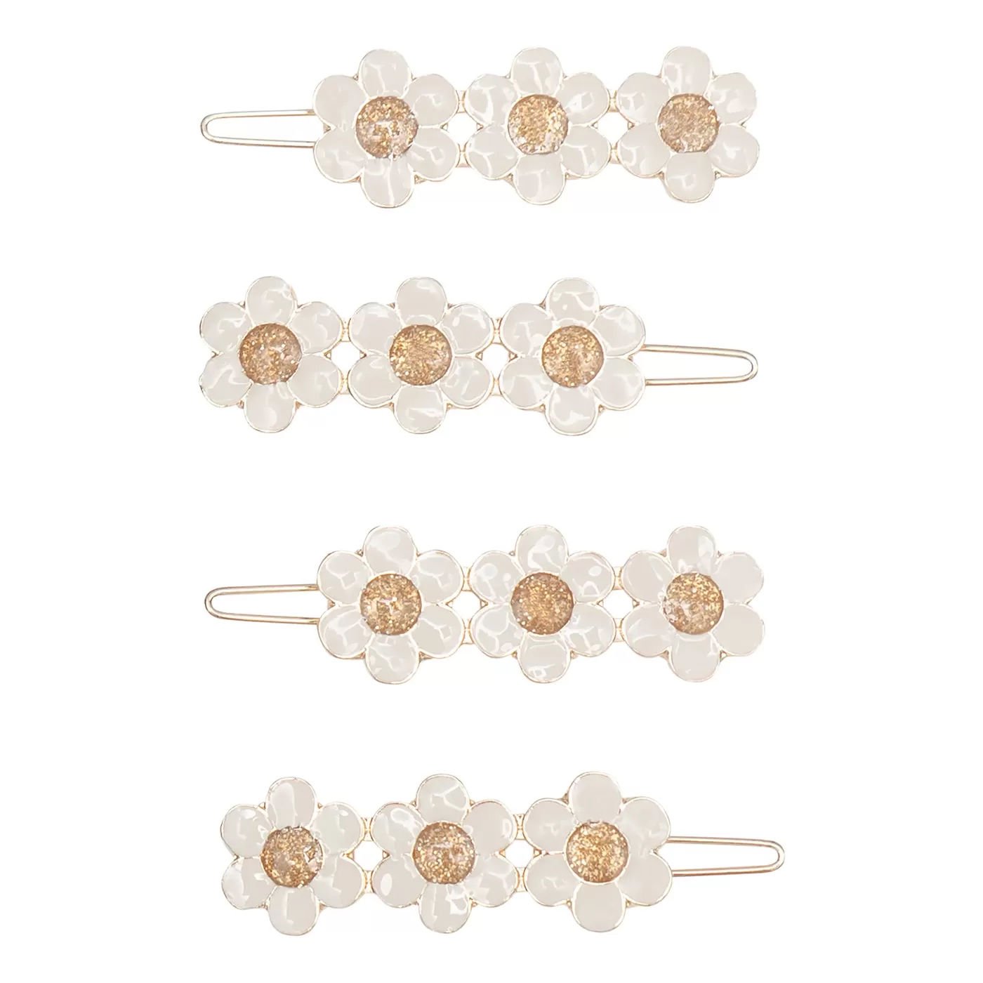Altın sim merkezli inci beyazı papatyalara sahip bu tokalar, daha kalın telli saçları toplamak için de ideal.
