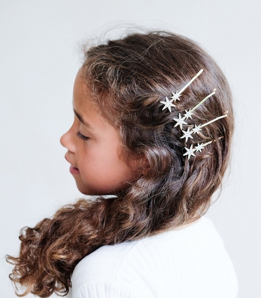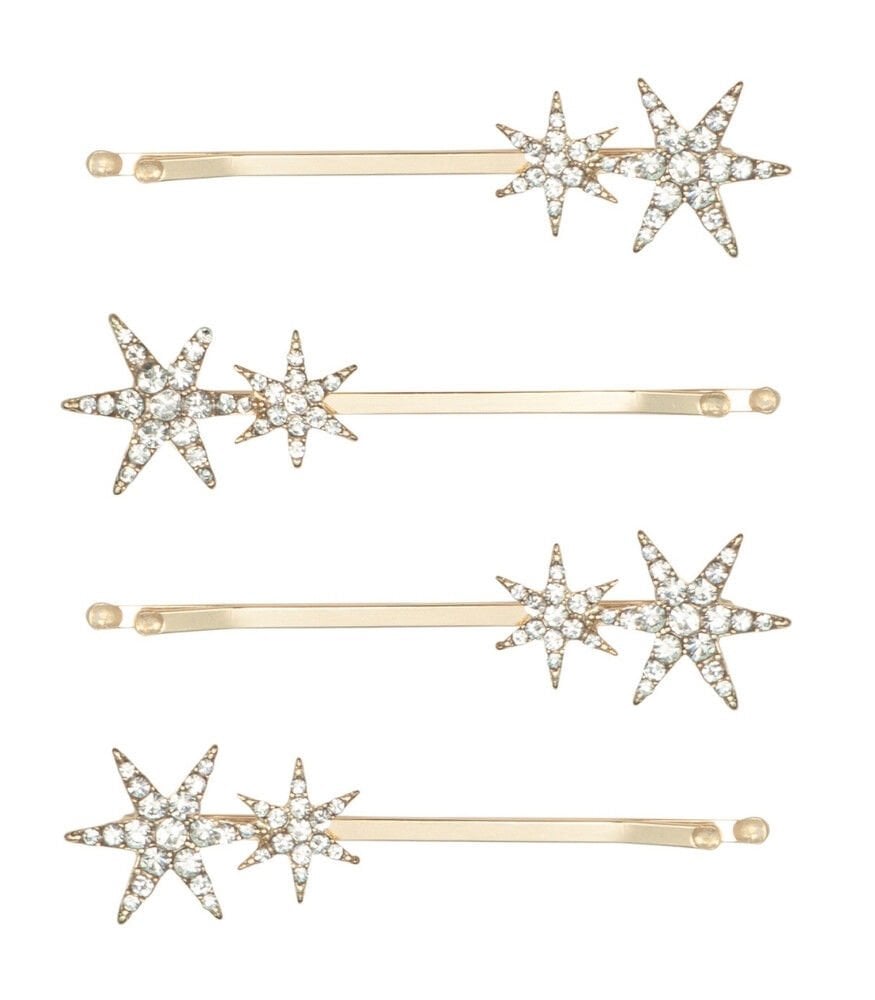 Pırlanta esintili taşlarla süslenmiş, yıldızlarla bezeli altın rengi saç tokaları.
