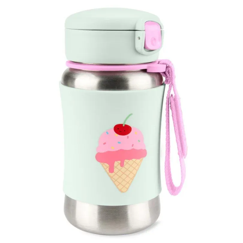 Miniğinizin yudumlarını alışılmışın dışında bir tarzla doldurun! Küçük kişiliklerin parlamasını sağlayan havalı tasarımlara sahip paslanmaz çelik su şişemiz, hareket halindeyken içeceklerin serin kalmasına yardımcı olur. Açılır kapanır kapak, esnek pipeti temiz tutarken kaymaz silikon kılıf küçük elleri soğuk yüzeylerden korur. Kayışından tutun ve hareket edin! Spark Style koleksiyonumuzun tamamına bugün göz atın.Özellikleri: