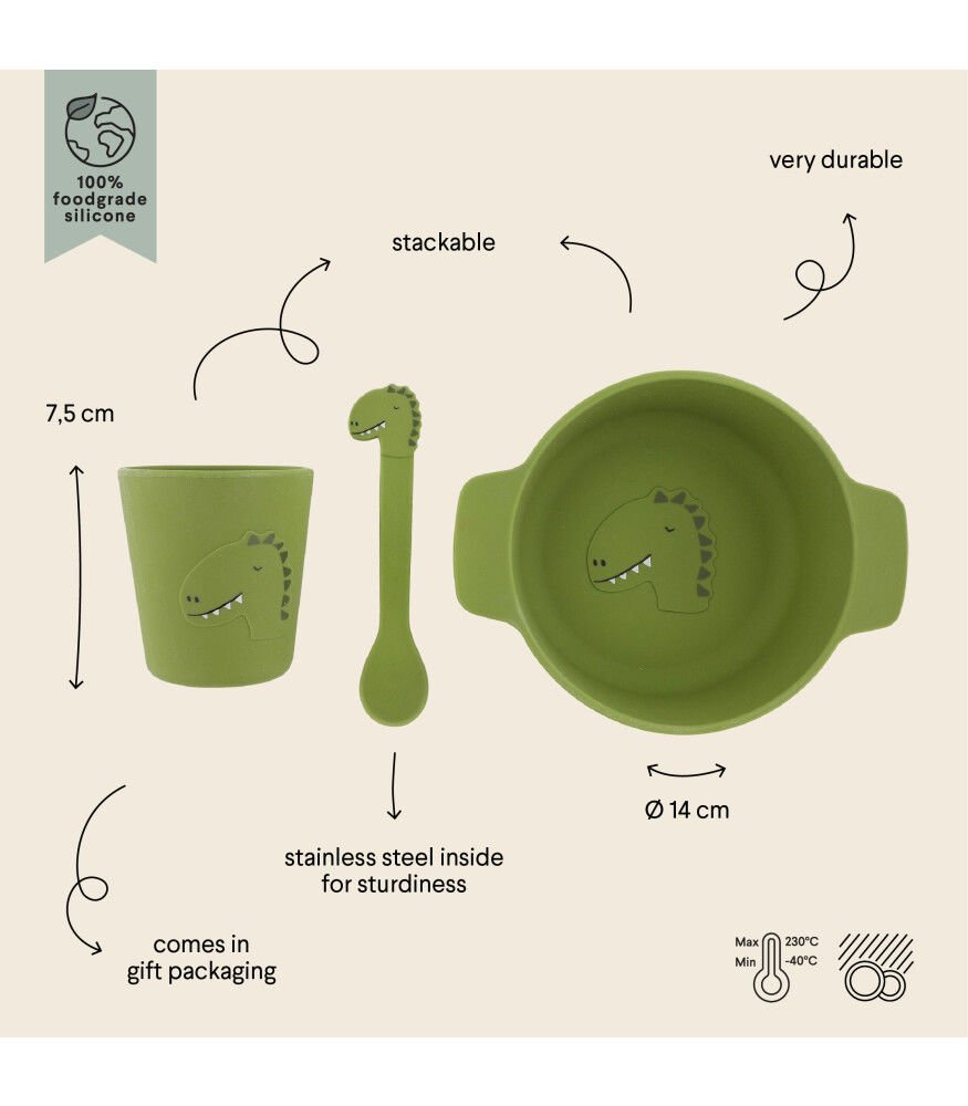 Tamamen sağlıklı silikondan üretilen bu set içeriğinde tabak, kase, bardak ve bir kaşık içeriyor.