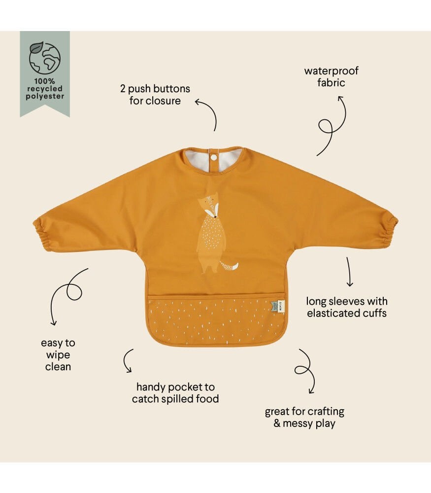 Bu neşeli önlük, pratik uzun koluyla birlikte gelir ve güzel bir yemeğin, içeceğin veya atıştırmalığın tadını çıkarırken bebeğinizin kıyafetini ise temiz tutar.